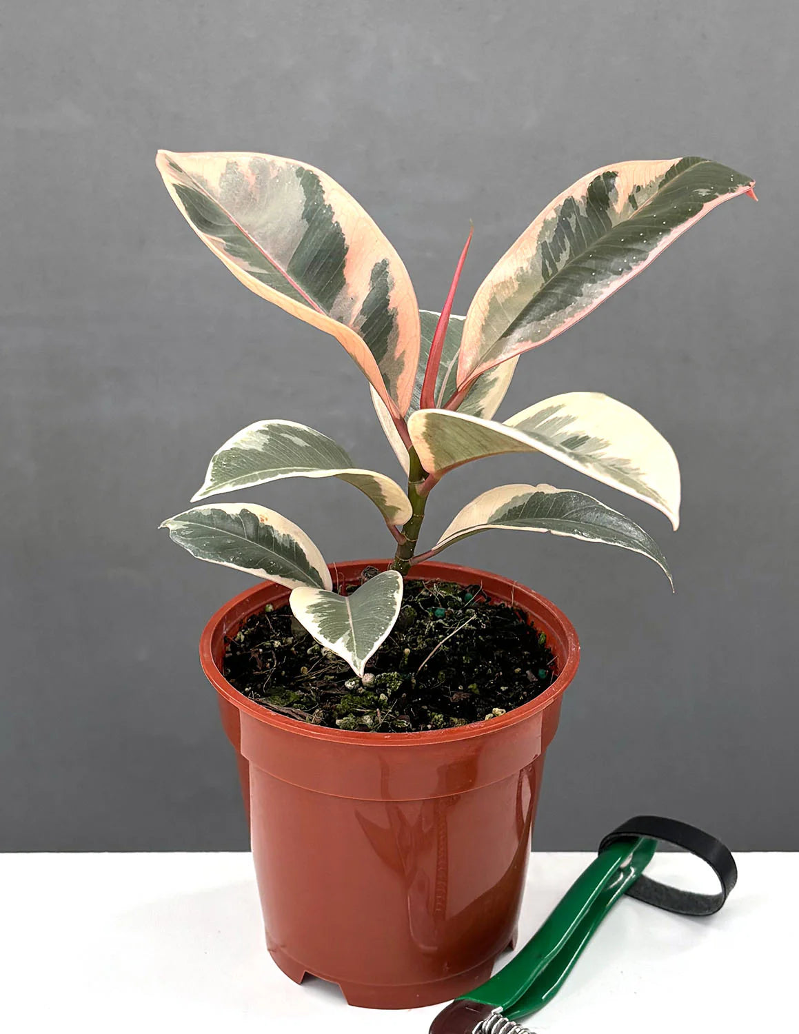 Description: Native to tropical regions of India and Malaysia, Ficus Ruby 'Tineke' is a hardy, vibrant evergreen plant with green-yellow and white variegation. Care is similar to other rubber plants, but the variegation requires more light than the 'Burgundy' variety. It won't do well in low light spaces, so place in bright indirect light. Water to keep soil moist at all times. Ficus elastica is a source of latex that is toxic to the skin, and poisonous if ingested, so pet-owners and those allergic to latex should be cautious.