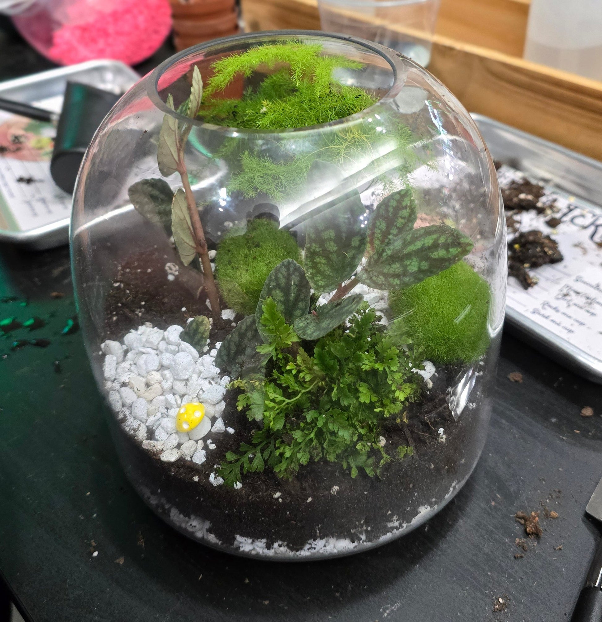 Each terrarium includes our standard globe glass and one plant (upgraded glass or multiple plants can be added at the time of event confirmation). 90-Minute Booking includes Terrarium Setup + Build Time + Cleanup.